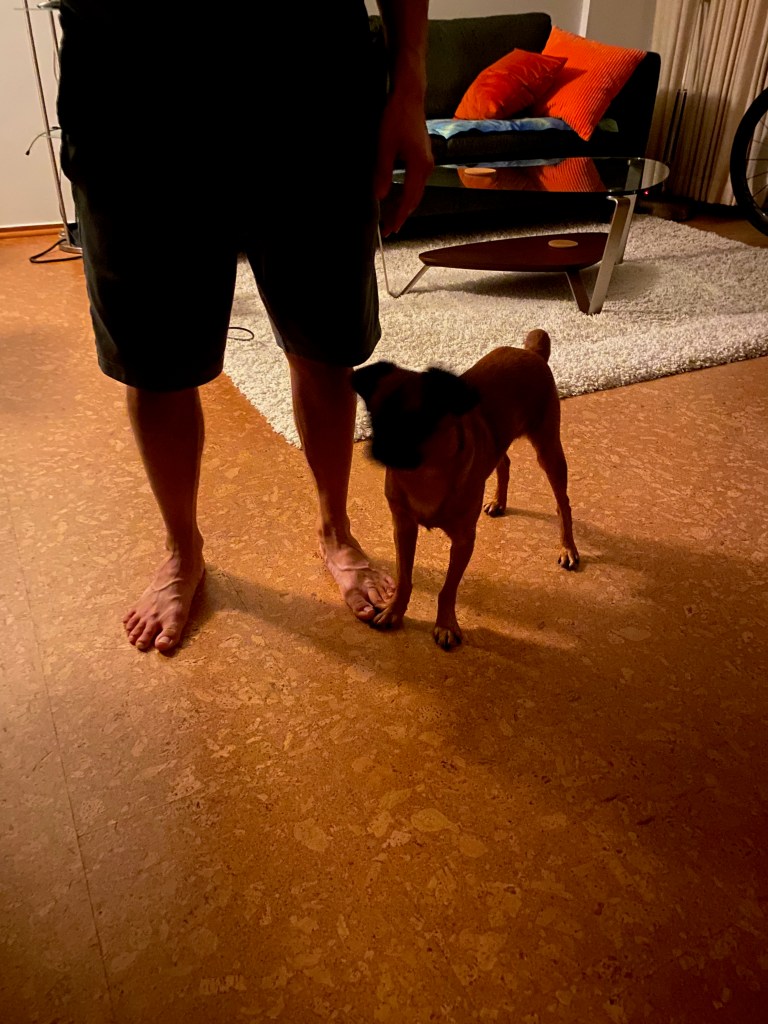I was initially pretty nervous about having Nalu come over my partner’s house. I knew that integrating my dog into my romantic life would be the final “test”. I was nervous to impose a dog upon my partner’s pristine and fairly minimalist lifestyle. My boyfriend’s house is the kind of house that culls tidy behavior out of you because it is always in a default minimalist/neat/clean/ tidy state. It has a white shag rug. And well-maintained white carpet in the bedroom. The tops of surfaces are clear and curated with a minimal number of necessary items, and one plant. It’s the kind of house where you wipe spilled water off of the sink after washing your face, because the water splashes look out of place, and the towel for sink drying is right there next to the sink beckoning for you to use it.
